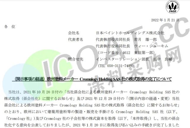 1月18日,科思创表示,通过约4至6百万欧元(约合人民币4300万元)范围内的收购价格,成功购买了JSR株式会社在合资公司日本精细涂料有限公司剩余30%的股份,从而使其成为科思创的全资子公司。
