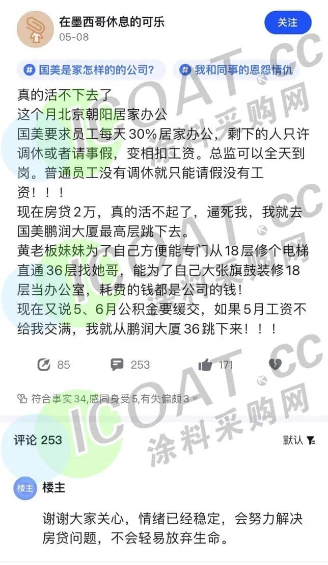 近日,知名家电品牌国美集团再遭吐槽。数名国美员工表示,自从北京多个区县实施居家办公以来,国美内部强制员工请年休假和事假,并且期间不发放薪水。社交平台上,也有不少国美员工验证了上述说法,“国美要求员工每天30%居家办公,剩下的人只许调休或者请年假,变相扣工资。”