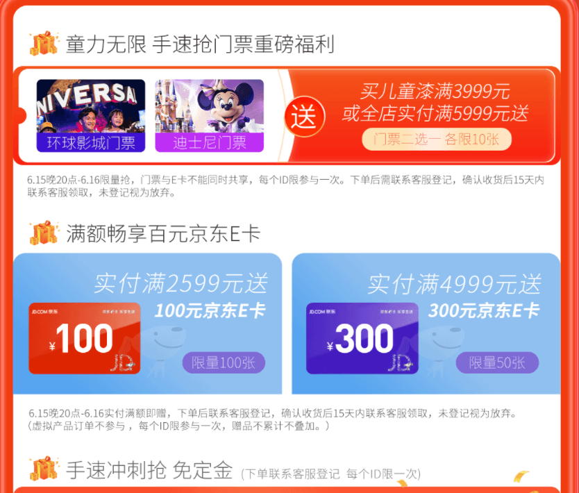 推出买儿童漆满3999元或全店实付5999元送环球影城门票/迪士尼门票、实付满2599元送100元京东E卡、实付满4999元送300元京东E卡优惠活动(限量)。预售前100名享免定金特权,原价599的抗甲醛净味全效面漆5L秒杀价199元(限量)。此外还有会员专享5元无门槛优惠券,多乐士会员储值折上折等活动。