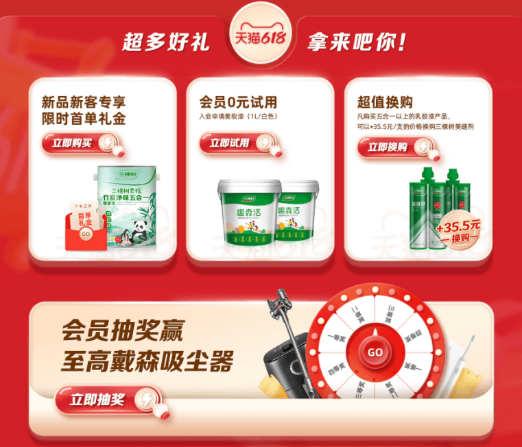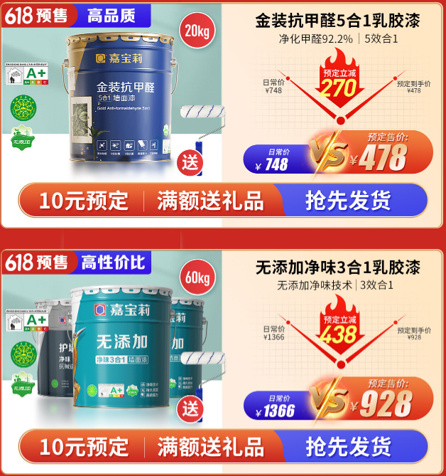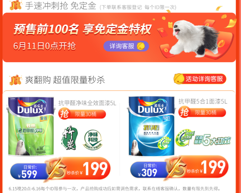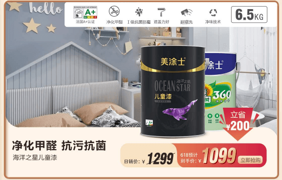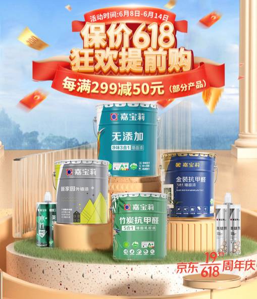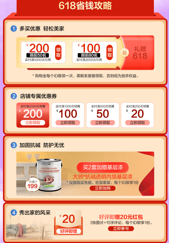推出“618省钱攻略”,实付满5000元可用200元优惠券(限前50名),实付满3000元可用100元优惠券(限前80名)。推出店铺专属优惠券,最高可优惠200元。部分产品加赠基层漆,此外部分产品直降970元。