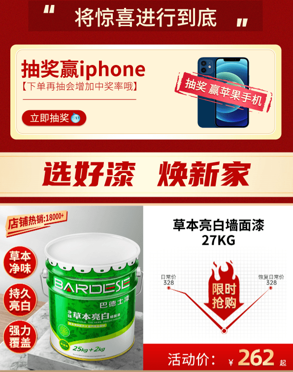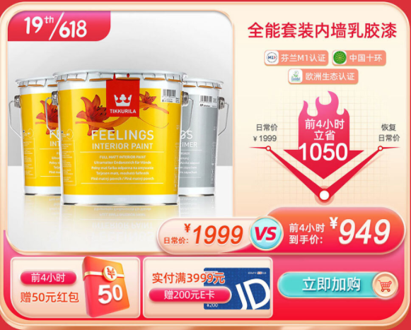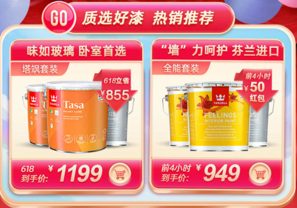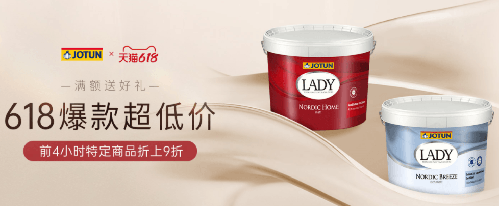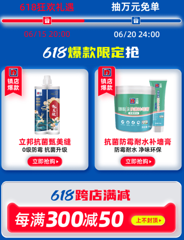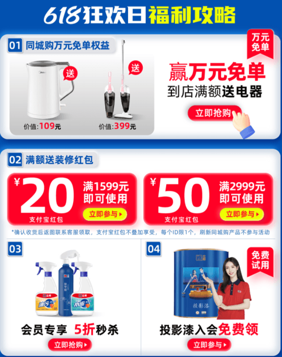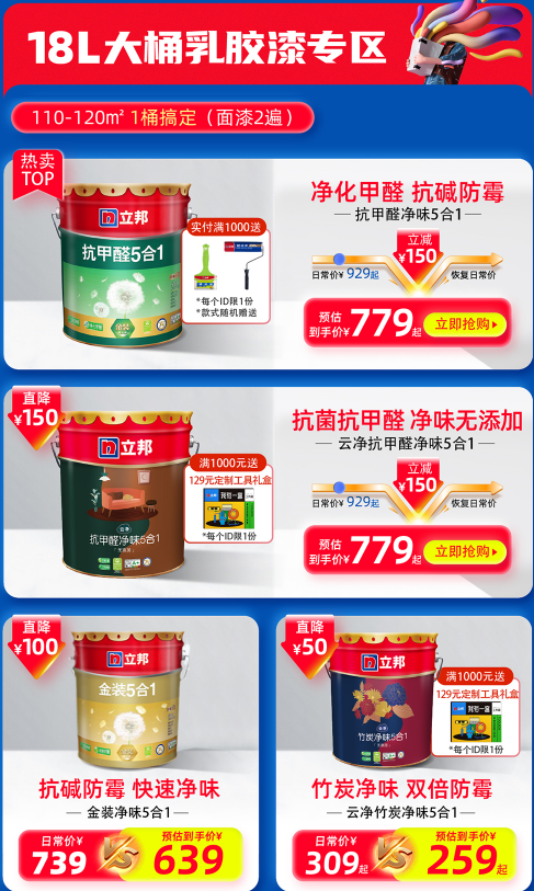 立邦涂料参与了淘宝618跨店满减活动,每满300元减50元(上不封顶),并推出了“618狂欢日福利”,到店满额赢万元免单,满额送装修红包,会员5折秒杀,以及玩转盘赢499礼盒等活动。除此之外,还实打实的对部分商品进行了立减50-150元的优惠,