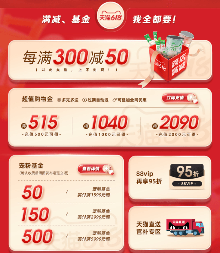 参与了天猫618活动,推出每满300减50优惠(上不封顶),充值2000元可得2090元超值购物金,实付满5999元赠500元宠粉基金,88VIP再享95折,以及会员0元使用,超值换购,新客专享首单礼金,会员抽奖等。