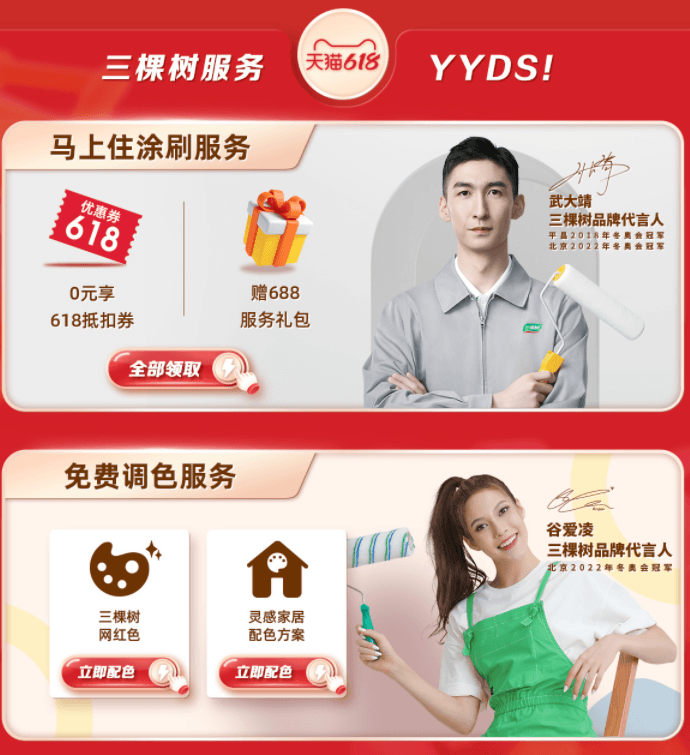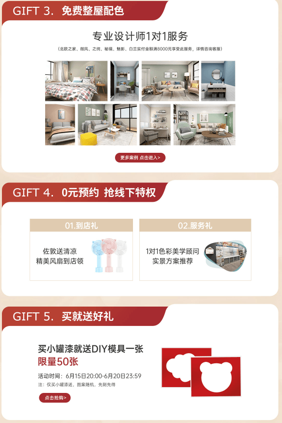 推出618优惠指南,可领会员30元无门槛优惠券,平台199-20跨店优惠券,399-40跨店优惠券,及799-80跨店优惠券,满3999元领200元E卡(限量)。可免费选色、免费试色、免费调色,部分产品立省1050元。