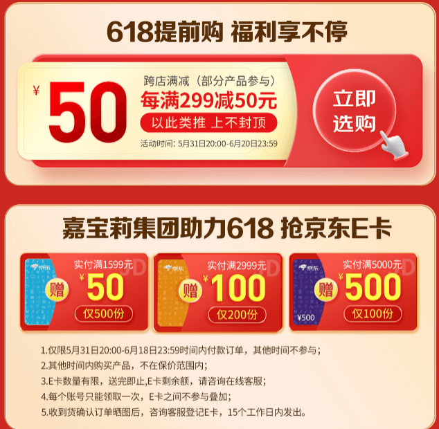参加京东“保价618狂欢提前购”活动,部分产品每满299元减50元,部分产品参与跨店满减,每满299元减50元(上不封顶),部分产品预定立减最高超过400元。