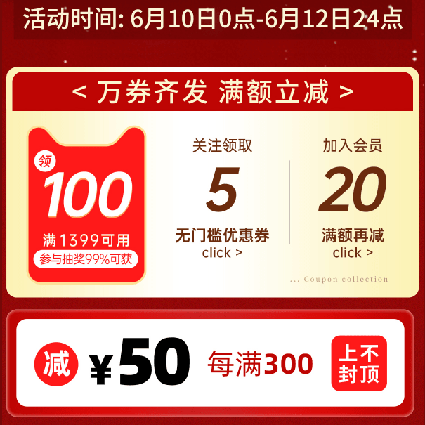 参加天猫618活动,开展“618智家日每满300减50”活动,下单抽奖赢苹果手机。万券齐发,满额立减,部分产品降价限时抢购。