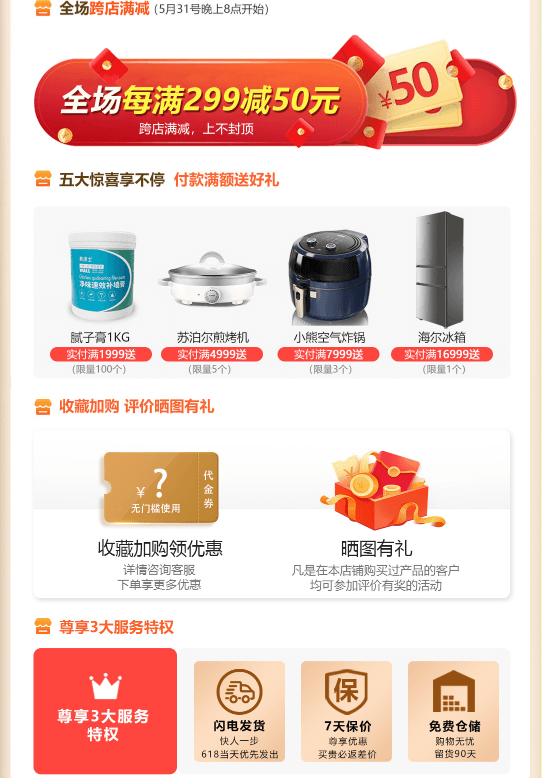 全场跨店满减,每满299元减50元(上不封顶),付款满额送豪礼,实付满1999-16999元分别赠送腻子膏、煎烤机、海尔冰箱等(限量),部分产品立省200元。