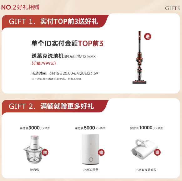 前4小时特定商品折上9折,每满300元减50元(跨店满减,上不封顶),1元抢100元有价优惠券,满额送洗地机、绞肉机、加湿器等礼品。此外提供免费整屋配色,0元预约抢线下特权,并赠送DIY模具等礼品。