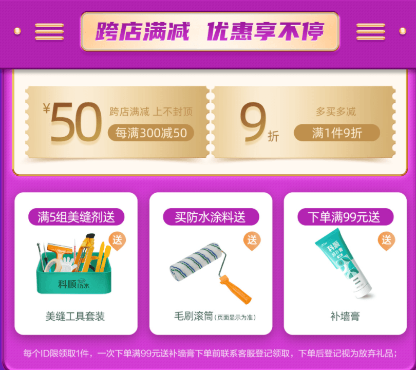 跨店满减,满300-50(不封顶),满1件9折,多买多减。购买美缝剂、防水涂料等赠送美缝工具、毛刷滚筒等。