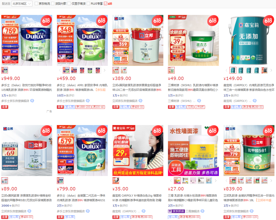此外,东方雨虹、亚士漆等知名涂料品牌企业也在线上官方旗舰店打出标语,参加平台满减活动,部分产品到手价给予了大力度的折扣等。在京东平台,也可以看到,以“涂料”为关键字,参与618活动的企业众多,满眼都是打折促销的火爆红色,商品品类和数量都超乎你的想象,更有买涂料送家电、满额送工具、抽奖送涂装、0元购等多种促销方式。