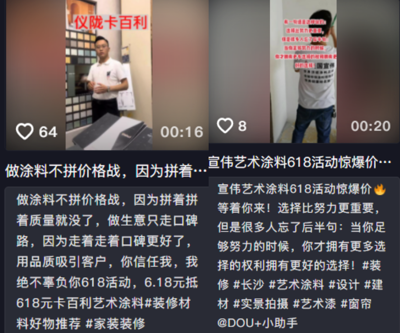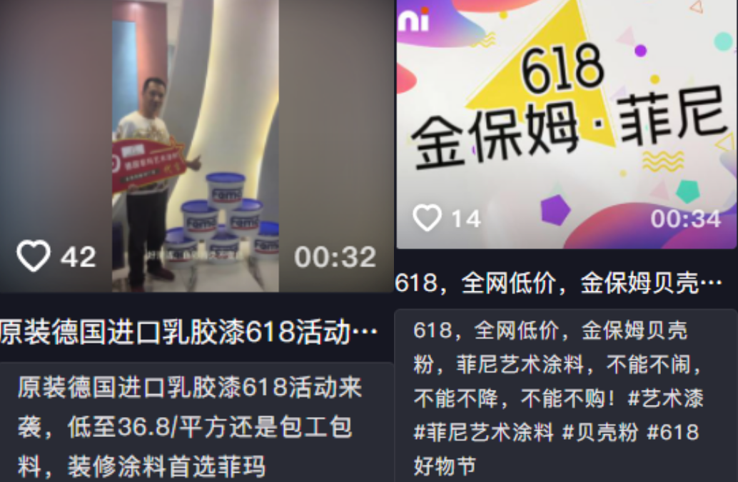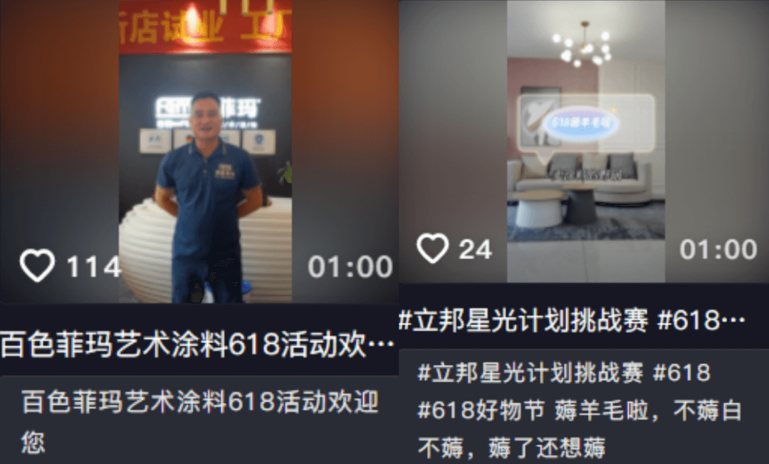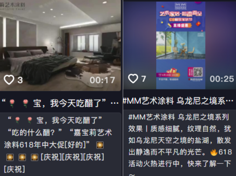 另外在抖音平台,艺术涂料、乳胶漆等品类的涂料企业也纷纷加入#618 #家装节等话题,打出惊爆价的旗号进行产品促销。相比于淘宝、京东等购物平台,抖音、快手等视频平台则更加灵活自由,宣传成本更低,如果开店还能享受平台给予的流量扶持和“万券齐发”奖励,更是令人心动。