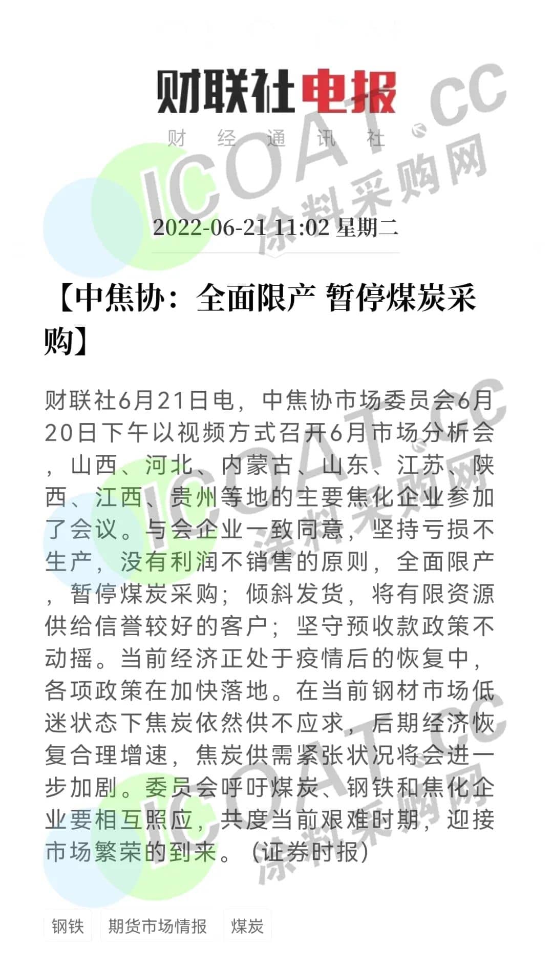 近日,中焦协市场委员会以视频方式召开6月市场分析会,山西、河北、内蒙古、山东、江苏、陕西、江西、贵州等地的主要焦化企业参加了会议。与会企业一致同意,坚持亏损不生产,没有利润不销售的原则,全面限产,暂停采购。