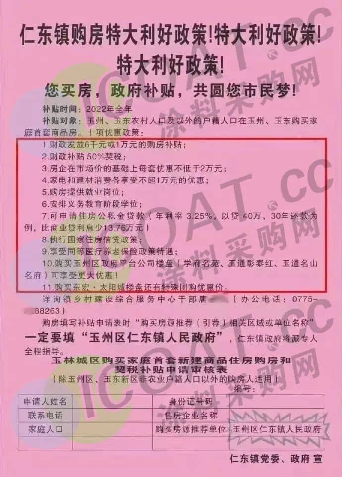 广西玉州仁东镇发布通知,“仁东镇购房特大利好政策”海报显示,广西壮族自治区玉林市玉州区仁东镇针对玉州、玉东农村人口及以外的户籍人口在玉州、玉东购买家庭首套商品房人群推出了十项重大利好补贴政策,包括但不限于6千-1万元的购房补贴,50%契税的财政补贴,以及购房提供就业岗位和安排义务教育阶段学位等。