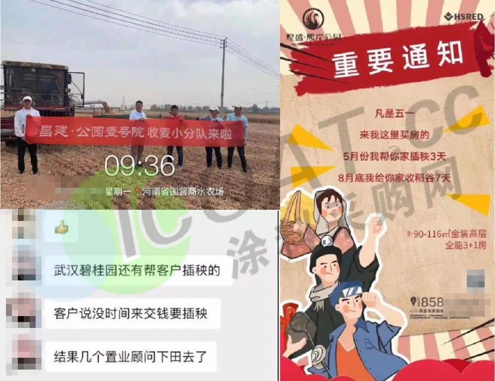 而在此前,湖北武汉碧桂园早已推出了令人心动的“买房帮插秧”活动。听说客户要插秧没时间来交钱,于是几个置业顾问果断下田去帮客户插秧,有置业顾问脱鞋下田派单推介;昌建·公园壹号院置业顾问专门组织小分队给客户收割小麦;煌盛·熙案公园项目,只要客户购房,不光帮插秧,还负责秋天收稻谷,一条龙服务。