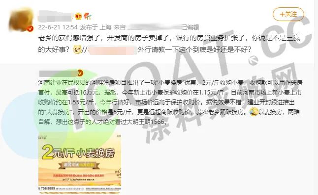 与此同时,在山东菏泽曹县,鸿基地产也在曹州壹号项目推出“成功购房,自家小麦按为2元/斤由项目收购并冲抵房款”活动。