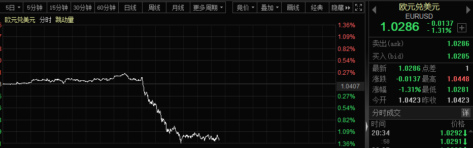 与此同时,欧元兑美元再次明显回落,北京时间17:49曾报1.0281,欧元兑美元EUR/USD跌至近20年低点。