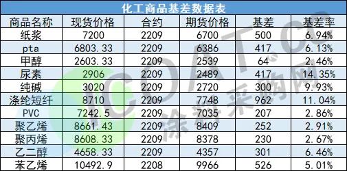 值得注意的是,纵观多种化工品现货与期货价格之间的基差数据可知,纸浆、pta、玻璃、甲醇、尿素、纯碱、短纤、PVC、聚乙烯、聚丙烯、乙二醇、苯乙烯等品种合约出现“期现倒挂”的情况,也就是期货价格比现货价格还要低。