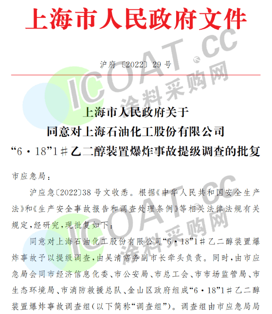 近日,上海市人民政府发布关于同意对上海石油化工股份有限公司“6·18”1#乙二醇装置爆炸事故提级调查的批复。批复称,同意对上海石化“6·18”1#乙二醇装置爆炸事故予以提级调查,由副市长牵头负责。