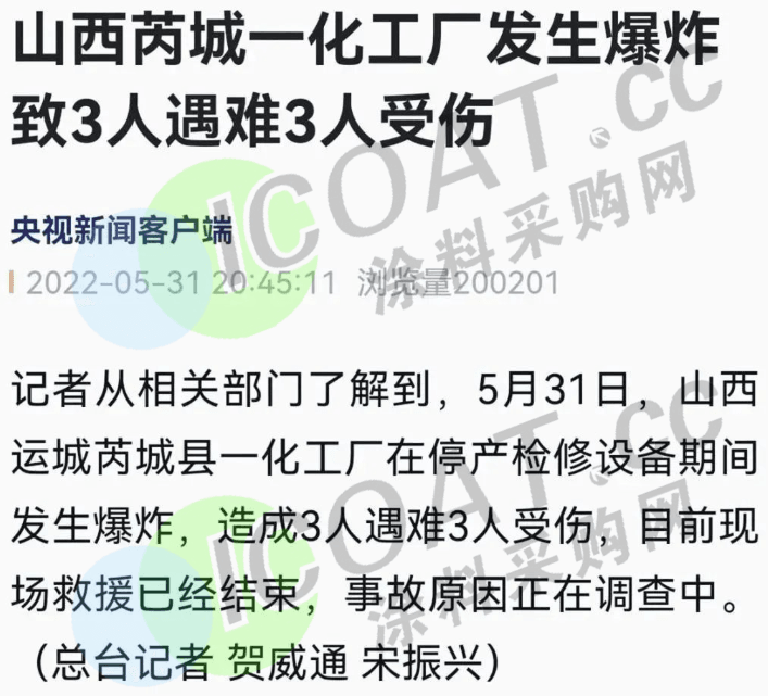 据涂料采购网了解,2022年年初以来,国内化工企业经历了停产减产和错峰生产等多重考验,但在开开停停中,爆炸、泄漏、起火等化工事故频发,给企业、行业、伤亡者及其家属,乃至整个社会都带来了极为不良的影响。