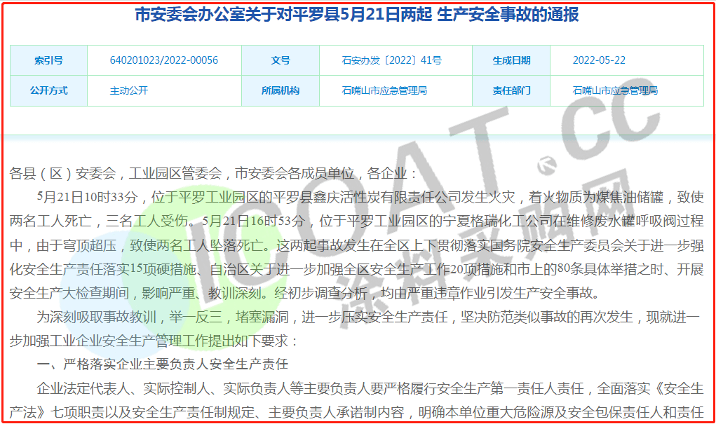 5月21日,宁夏石嘴山平罗县平罗工业园区的平罗县鑫庆活性炭有限责任公司发生火灾,着火物质为煤焦油储罐,致使2名工人死亡,3名工人受伤。经初步调查分析,事故由严重违章作业引发。