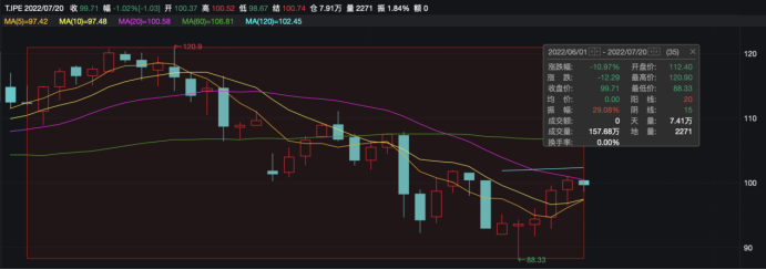 原油方面,国际油价21日大跌,截至当天收盘,纽约商品交易所9月交货的轻质原油期货价格下跌3.53美元,收于每桶96.35美元,跌幅为3.53%;9月交货的伦敦布伦特原油期货价格下跌3.06美元,收于每桶103.86美元,跌幅为2.86%。WTI原油期货6月份以来跌幅为11.19%,自7月5日跌破100美元/桶之后,已连日在“100”这一重要心理关口附近徘徊。
