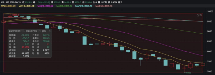 有色市场,6月份以来,有色金属市场可谓愁云惨淡。截止7月20日,被视为世界经济晴雨表的伦敦铜价跌幅达到21.67%,触及2021年初以来的最低水平。与此同时,锌和镍下跌21%和23%,铝和铂金价格下跌约13%。以整个第二季度计算,LME一篮子最重要的工业金属的价格跌幅比2008年金融危机以来的任何时候都要大。