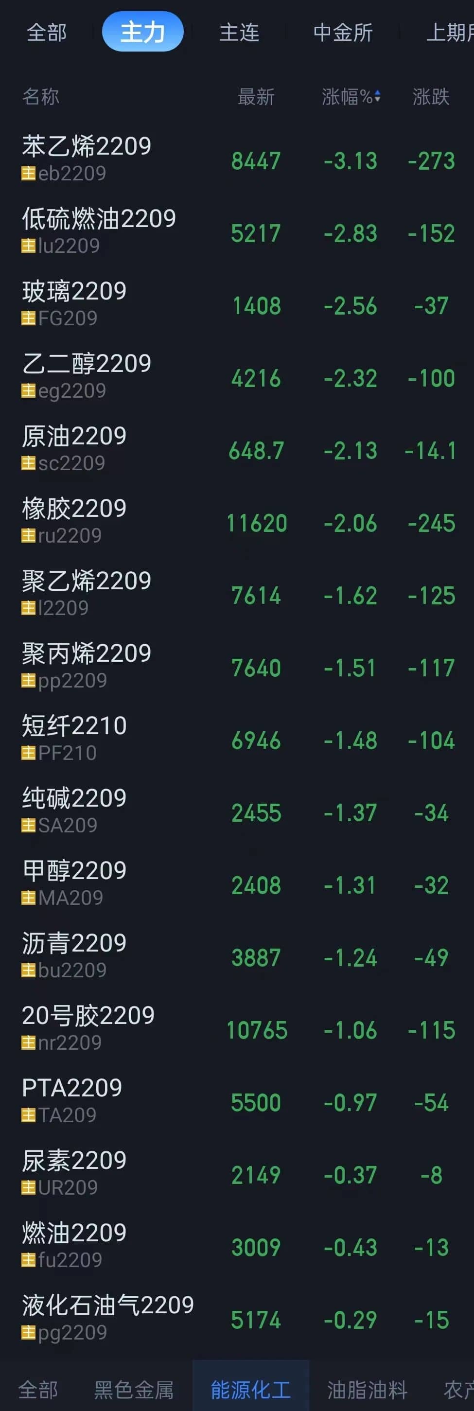化工市场也出现了较大的变动,22日,国内期货开盘普跌,棕榈油跌3%,低硫燃油、苯乙烯、玻璃、乙二醇、SC原油、橡胶跌超2%,PTA、沪锡、焦炭、甲醇跌超1%。