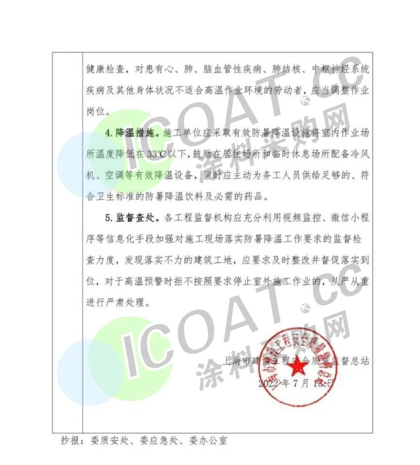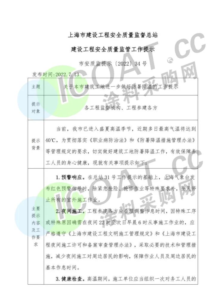 国际大都市上海经历了长达几个月的封控后,如今再发“停工”通知。近日,上海市安质监总站发布《关于本市建筑工地进一步做好防暑降温的工作提示》,通知要求,切实做好建筑工地防暑降温工作,在总站31号工作提示的基础上,上海气象台发布红色预警信号时,除紧急抢险、抢修作业等特殊要求外,全天停止所有的室外施工作业。