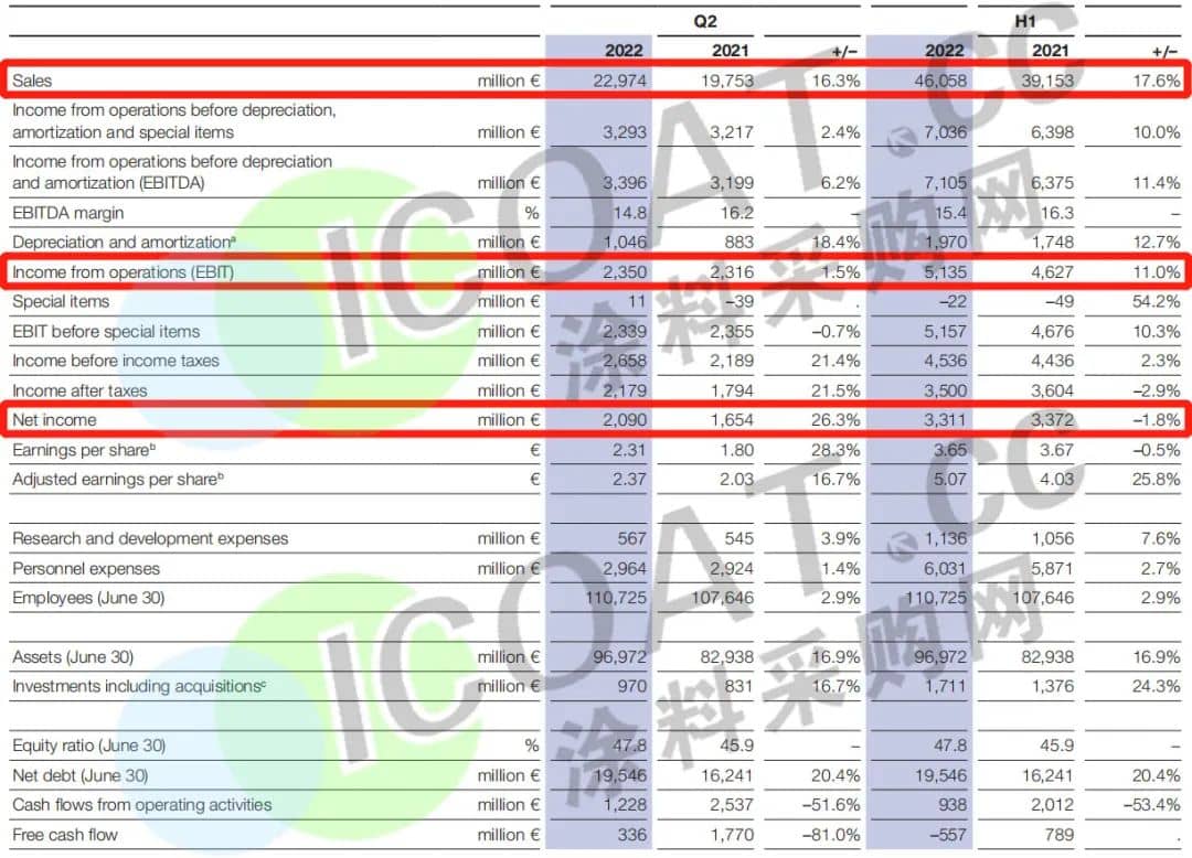 巴斯夫:今年上半年实现销售额为460.58亿欧元(约合人民币3162.2亿元),同比增长17.6%;EBITDA为71.05亿欧元,同比增长11.4%;营业利润为51.35亿欧元,同比增长11.0%;不计特殊项目的息税前利润51.57亿欧元,同比增长10.3%;净利润为33.11亿欧元(约合人民币227.32亿元),同比下降1.8%。