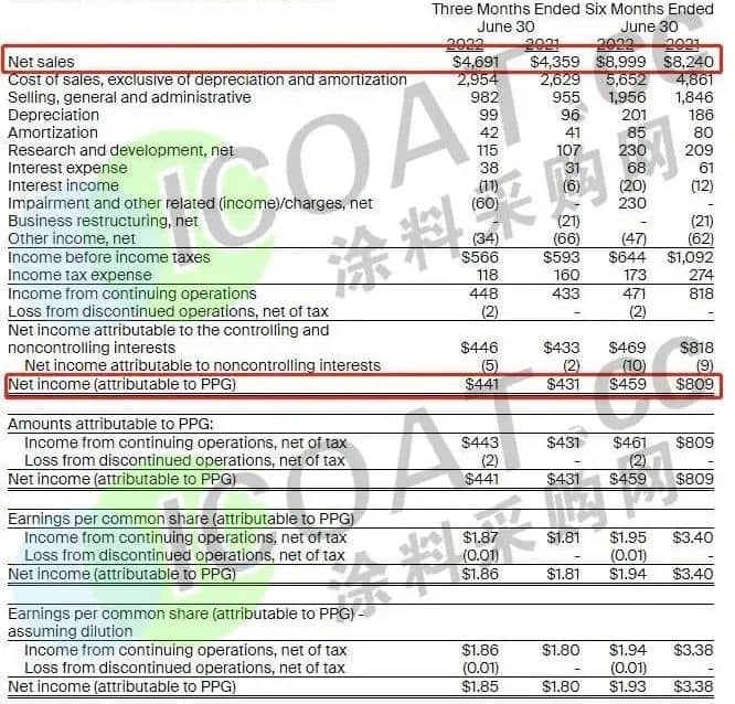 PPG:上半年,PPG实现净销售额90亿美元(约合人民币609.78亿元),同比增长9%;净收入为4.6亿美元(约合人民币31.16亿元),同比下降43%。