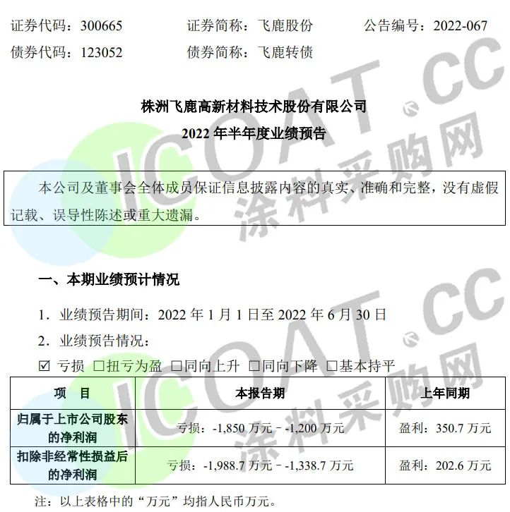 飞鹿股份:预计2022年上半年归属于上市公司股东的净利润亏损1200万元~1850万元,由盈转亏,上年同期盈利350.7万元;扣除非经常性损益后的净利润亏损1988.7万元-1338.7万元,上年同期盈利202.6万元。