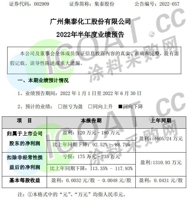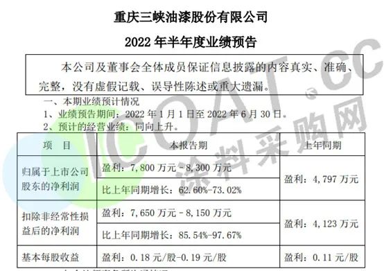 重庆三峡油漆股份有限公司:预计2022年上半年半年度归母净利7800万元-8300万元,同比增长62.60%-73.02%。