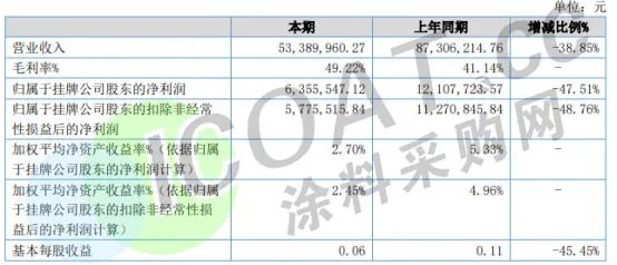 中航新材:发布2022年半年度报告,报告期内公司实现营业收入53,389,960.27元,同比下滑38.85%;归属于挂牌公司股东的净利润6,355,547.12元,同比下滑47.51%。