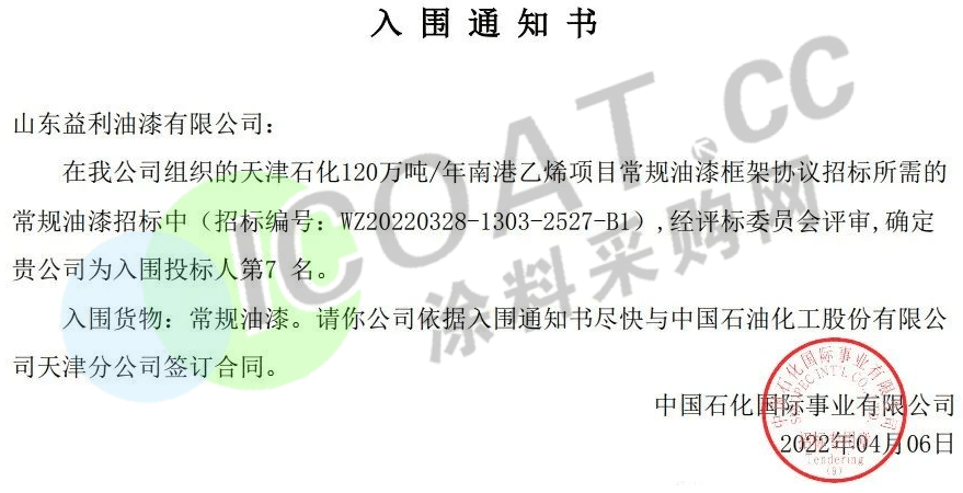长江涂料以优异的成绩中标中石化2022年度涂料采购招标常用漆、水性工业漆、建筑涂料三个项目包。
