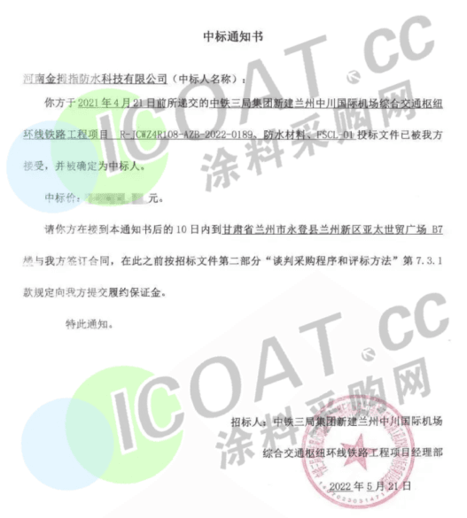 中交集团供应链采购管理系统发布了中交四公局第三工程有限公司2022年度防水材料(含施工)框架协议供应商入围招标采购评标结果公示,北京东方雨虹防水工程有限公司、科顺防水科技股份有限公司、北新禹王防水工程有限公司、北京金盾建材有限公司、株洲飞鹿高新材料技术股份有限公司、禹王(北京)科技工程有限公司、河南恒腾防水防腐有限公司成为该项目拟中标单位。