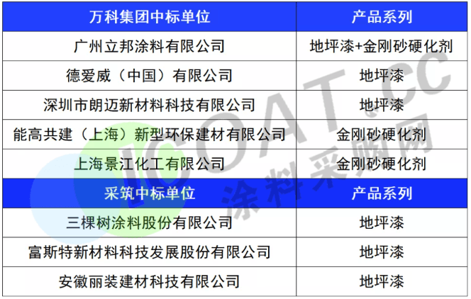 采筑官方微信公众平台发布了万科、采筑地坪材料集采中标公告。其中,广州立邦涂料有限公司、德爱威(中国)有限公司成为万科集团地坪集采中标单位;三棵树涂料股份有限公司成为采筑中标单位。