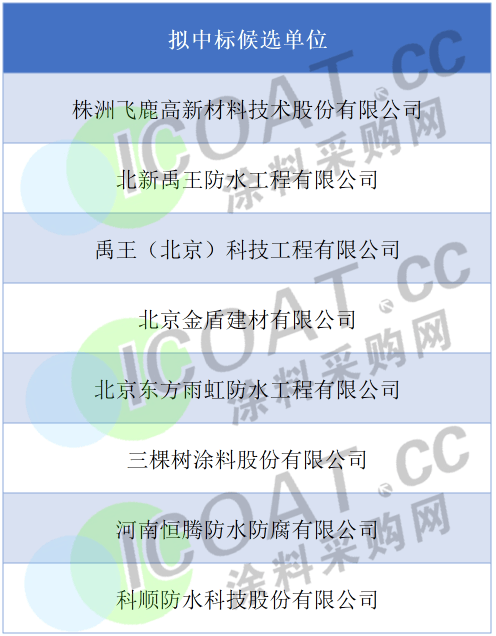 中国交建物资采购管理平台和中国电建设备物资集中采购管理平台发布了多个项目防水材料采购中标公告。其中,北京东方雨虹防水技术股份有限公司、三棵树涂料股份有限公司、雨中情防水技术集团股份有限公司、成都赛特防水材料有限责任公司、中建友(唐山)科技有限公司、远大洪雨(唐山)防水材料有限公司和大禹九鼎新材料科技有限公司成为多个防水材料采购项目中标候选人。
