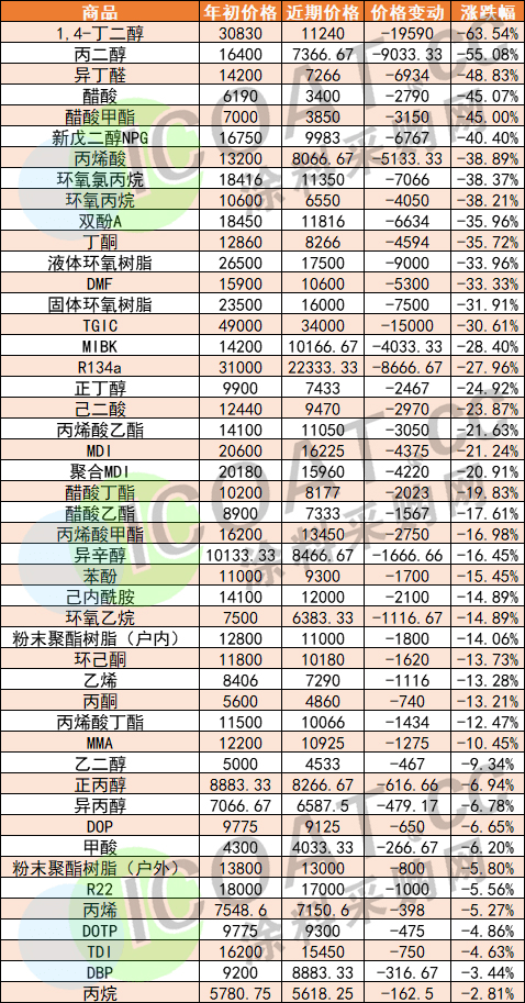 石油产业链上受到直接影响而价格下跌的化工品超过40余种,其中丁二醇、TGIC吨价下跌均超过万元,丁二醇、丙二醇的跌幅超过50%,堪称腰斩。