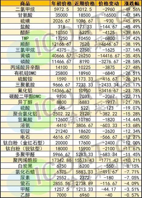 而在原油产业链之外的其他产业链上,也有30余种化工品价格下跌,最高下跌近50%。其中不乏天然气化工产业链上的尿素、有机硅,煤化工产业链上的乙醇、醋酐,以及磷矿、钛矿等下游的黄磷、钛白粉等。