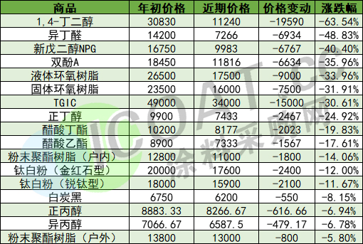 值得注意的是,涂料产业链上游的原材料也在其中。比如钛白粉、TGIC助剂、液体/固体环氧树脂、粉末用户内/户外聚酯树脂等,以及再上一层的环氧氯丙烷、双酚A、异丁醛、新戊二醇,和乳液所需的大宗化工品等均出现了下滑,其中环氧树脂、钛白粉等吨价下跌超过千元。也就是说,尽管钛白粉已经涨价2轮,树脂、乳液等上游供应商也在陆续宣涨,但最终的结果还是出现了涨幅均被吐出的情况。