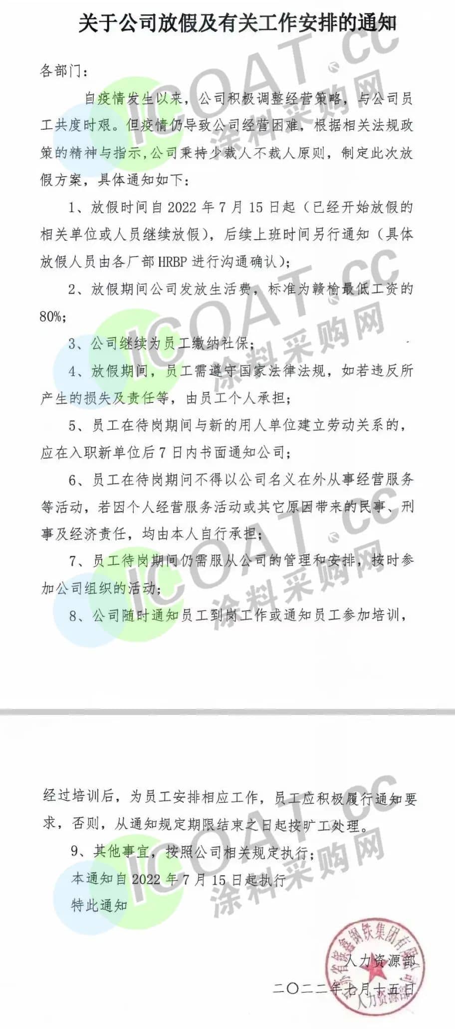 近日,一份放假的通知在网上疯狂流传。江苏镔鑫钢铁集团关于放假及有关工作安排的通知中要求,7月15日起,全员开始放假,后续上班时间另行通知。放假期间,工资按照连云港市赣榆区当地最低工资的80%缴纳。