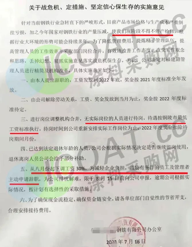 除了江苏镔鑫钢铁,某200万吨规模钢厂也发布了通知,提出目前市场价格比生产成本还低,成本严重倒挂,所以不得不停产检修,而且并不对后期看好,预计大环境不好将持续多年。为降低管理费用,精简团队改革,对自己主动辞职的员工,工资可以发到年底,还会按上一年的奖金去发,由公司主动解雇的,工资只发到本月,留下来的员工,工资减薪30%。