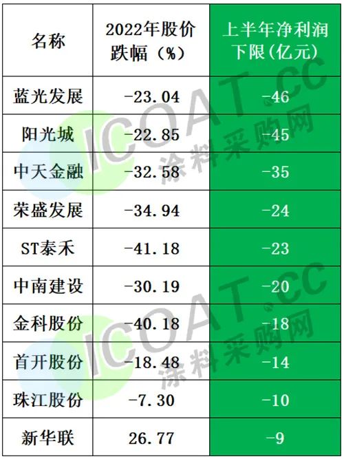 蓝光发展、阳光城和中天金融亏损最多,今年上半年预计亏损35亿元至46亿元。荣盛发展、ST泰禾和中南建设紧随其后,亏损额在20亿元至24亿元之间。此外,荣盛发展、ST泰禾和中南建设上半年亏损都超20亿元,各企业叙述亏损原因大多数是市场需求下降、销量下降。