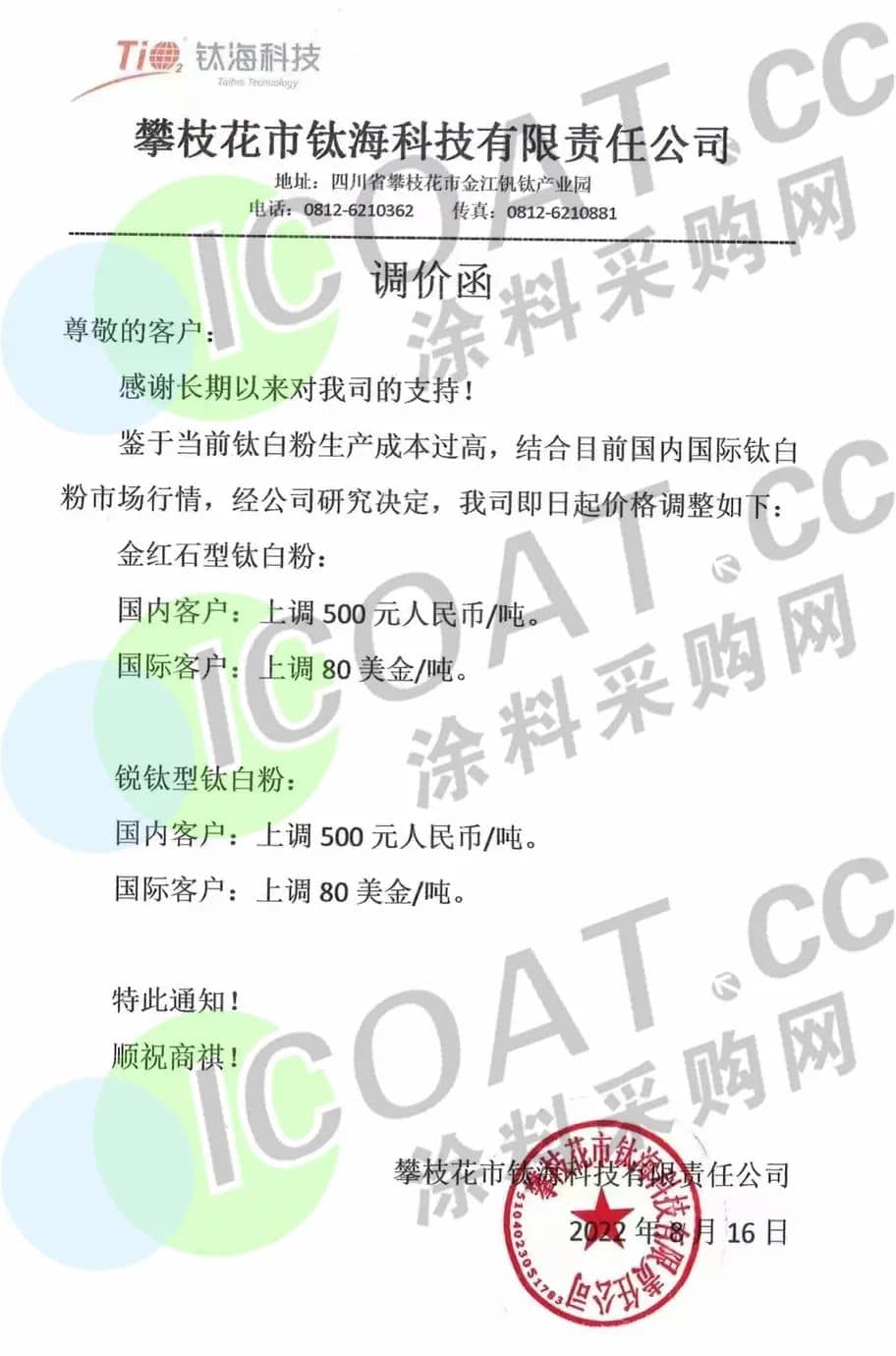 近日,攀枝花市钛海科技发布调价函,称鉴于当前钛白粉生产成本过高,结合目前国内国际钛白粉伟德官方网址导航,经研究决定,即日起价格调整如下,金红石型钛白粉、锐钛型钛白粉国内客户上调500元/吨,国际客户上调80美元/吨。