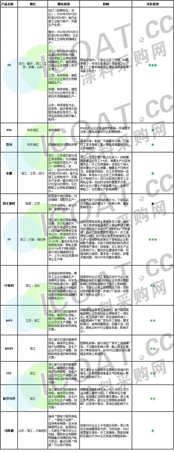 7月以来,整个西南地区降雨均普遍不佳,多省罕见的大范围限电仍在持续,或将蔓延至珠三角及长三角地区等制造业重地,影响也在日益加大。而随着越来越多的地区加入到这个队伍中来,也将出现越来越多的化工品供应和走势出现急剧变化,甚至有望为即将到来的“金九银十”打响第一枪。