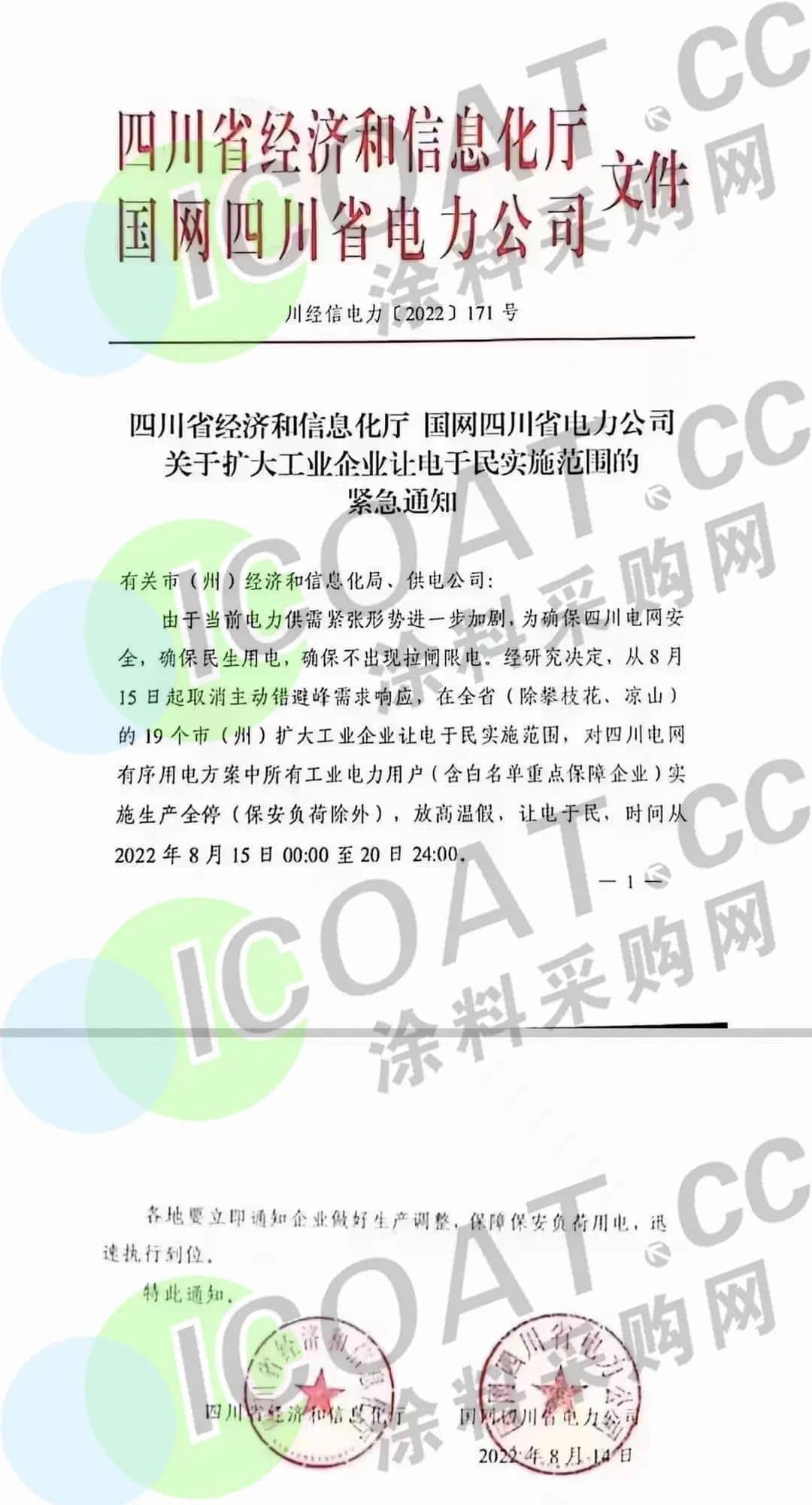 近日,四川省经信厅和国网四川联合下发了《关于扩大工业企业让电于民实施范围的紧急通知》,要求从8月15日起,四川省(除攀枝花、凉山)的19个市(州)扩大工业企业让电于民实施范围;对四川电网有序用电方案中所有工业电力用户(含白名单重点保障企业)实施生产全停(保安负荷除外),时间从8月15日零时开始,至8月20日24时结束。