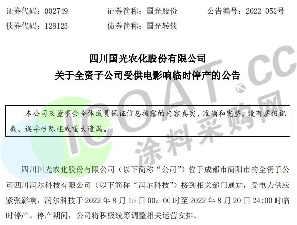 农药生产企业国光股份:受电力供应紧张影响,其全资子公司润尔科技将于8月15日零时至8月20日24时临时停产。