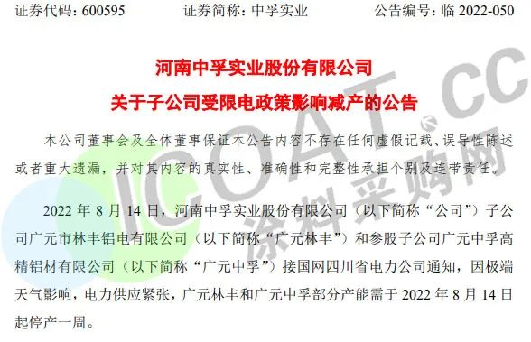 铝业龙头中孚实业:子公司广元林丰和参股子公司广元中孚部分产能需于8月14日起停产一周。预计将影响上述两家子公司电解铝产量合计减少1.29万吨,对应减少净利润约0.78亿元。