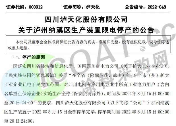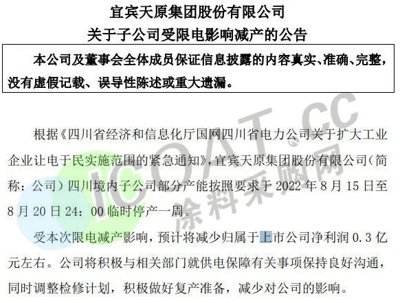 氯碱龙头天原股份:四川境内子公司部分产能按照要求于2022年8月15日至8月20日24时临时停产一周。
