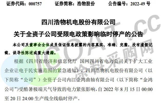整车销售龙头浩物股份:全资子公司内江金鸿曲轴有限公司受酷暑极端天气导致的电力紧张影响,自8月15日00:00至20日24:00生产线全线临时停产。