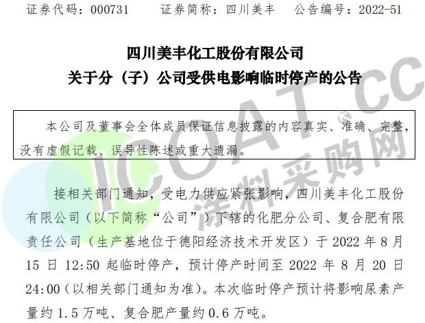 化肥龙头四川美丰:分(子)公司受供电影响临时停产,本次临时停产预计将影响尿素产量约1.5万吨、复合肥产量约0.6万吨。